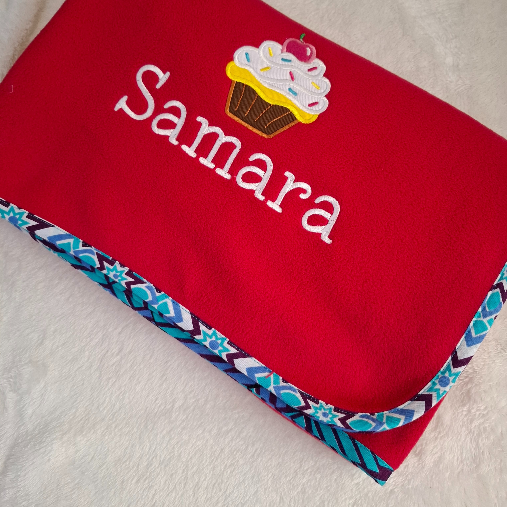 - Personalisation: the name Samara embroidered in white thread with a cupcake design.
